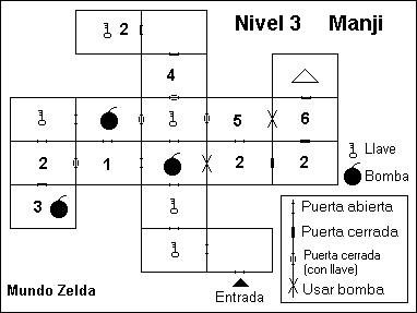 Ve al oeste y toma la llave. Ve al north y destruye a todos los enemigos y podrás encontrar la llave. Ve al norte y mata a todos los Darknuts y toma las bombas. Ve al oeste y toma la brújula, camina al oesto, de nuevo y luego al sur. Aquí encontrarás la Balsa. Ve al norte 2 veces y toma la llave. Ve al este y mata a todos los Keese para tomar bombas. Ve a la derecha y mata a todos los Zols para tomar la llave. Si tu quieres, puedes ir al norte, pero no es necesario. Puedes encontrar algo de información, acerca de la Espada Blanca y también de la llave para ir al norte. Si no quieres ir al norte o no quieres ir atrás, camina al este y toma el mapa Tu puedes romper la pared del este para acortar camino y enfrentarte con el jefe, Manhandla, pero tu puedes también ir al sur, leugo al este y al norte para ir donde Manhandla. El jefe de este calabozo es mucho más dificil que los anteriores. Usa bombas en Manhandla y trata de matar a el con una bomba. Trata de tirarle la bomba al centro. Cuando mates al jefe, ve al norte para encontrar la trifuerza.