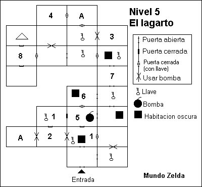 principio. El nivel cinco está en las colinas perdidas, que están en la parte norte de Hyrule, cerca de la cascada. Ves a la derecha cuatro pantallas, arriba cinco mas, una a la derecha, arriba una pantalla, a la izquierda, y arriba cuatro pantallas. ¡Ahora metete en la mazmorra!