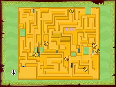 En medio del océano te vas a encontrar con unas ranas doradas saltando por el agua. Si les disparas con el cañón se pararán a hablar contigo. Si no has hablado con el Patrón Dorado (el jefe de estas ranas) no pasará nada pero si lo has hecho, te darán un símbolo que te servirá para crear un atajo a ese mismo punto. Es muy útil para no tener que recorrer el océano entero una vez que encuentres a todas las ranas (son 6). Para encontrar al Patrón Dorado debes ir a la Isla Ignota situada en el cuadrante noroeste del océano. Allí descubrirás que no existe un mapa de la isla. Tu objetivo es dibujarlo, ve andando por la costa para conocer los límites y ve dibujando el contorno en la zona del mapa. Una vez dibujado toda la isla verás que tienes la forma de una ballena. Lo siguiente que debes hacer, es localizar en el mapa las 5 piedras que te dan información, entonces habla con la que se encuentra en el centro de la isla. Te dirá que si golpeas a las otras 4 piedras en el orden correcto se abrirá un nuevo camino y te da unas pistas para ello (impulsa, espurrea. aleteando y ve su destino). El orden es el siguiente, primero la que está en la cola de la ballena (impulsa), segundo el del chorro de agua (espurrea), tercero en la aleta (aleteando) y por último el que está en el ojo (ve su destino). Así se abrirá un camino que te conduce a una cueva. Allí dentro vas a encontrar al Patrón dorado, Rasheen. Al hablar con él conseguirás la pizarra batracia. Al obtenerla podrás salir de la isla y regresar al barco. A partir de ahora, si encuentras una rana saltando en el agua y le disparas con el cañón, podrás adquirir un símbolo especial. Al dibujarlo en la pizarra batracia conseguirás que un torbellino te lleve hasta ese punto. Hay seis ranas en todo el océano. Aquí abajo tienes un mapa con la localización de todas ellas (si pasas el cursor por encima verás sus símbolos).